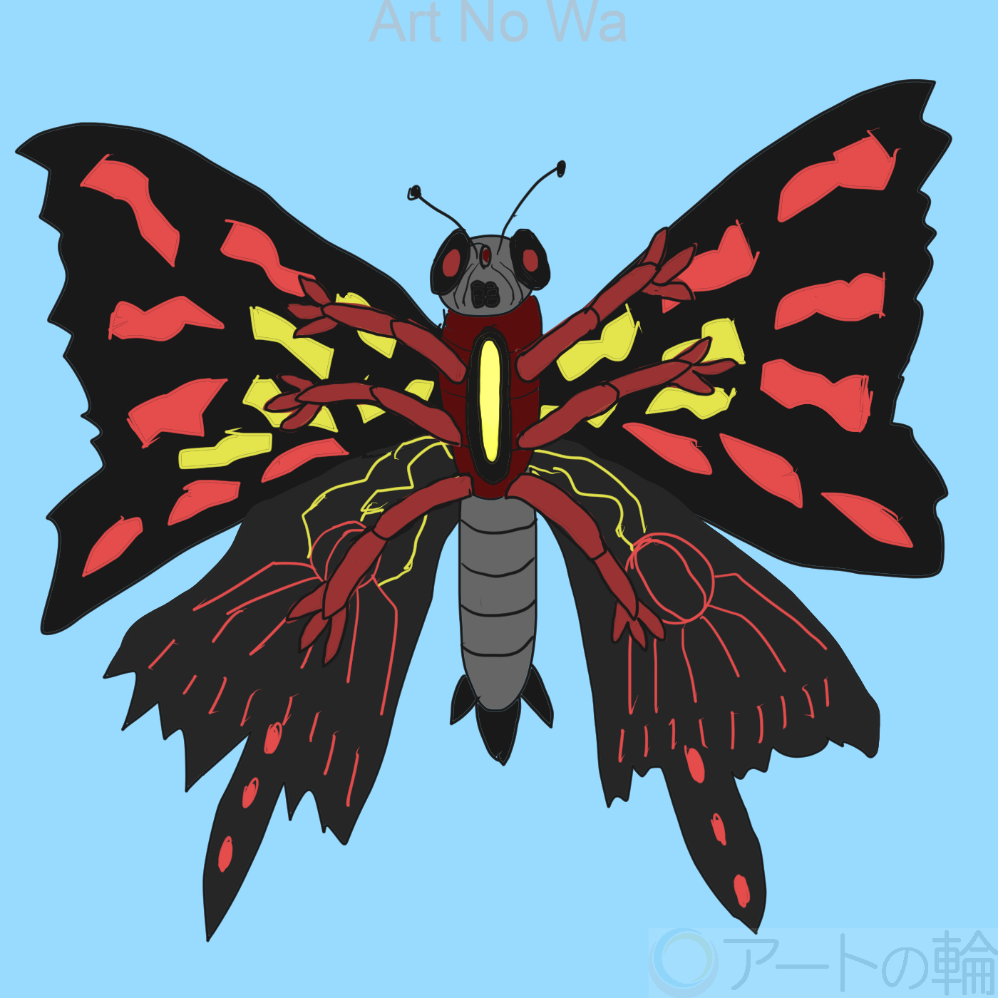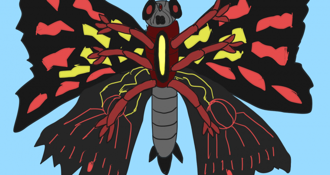 特撮に出てくるような怪獣を描いてみました。詳細は「身長30メートル、翼長220メートルの黒い蛾のような怪獣。翼から雷のような光線を使って攻撃する。胴体の光体から放つ光弾は山を簡単に破壊する威力がある」怪獣図鑑を連想してもらえるような感じで描いてみました。