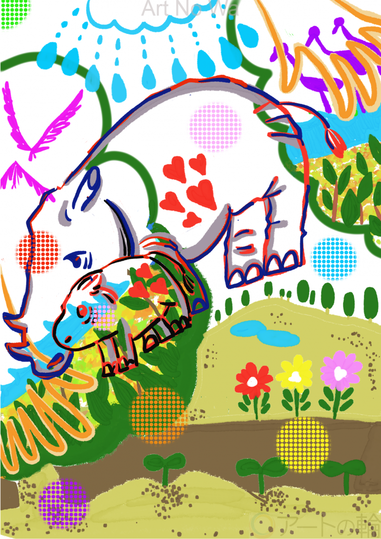 砂漠には沢山の緑や水の恵みを、それによって絶滅危惧種に指定されているサイ達動物が守られていくというのを意識して描いてみました。