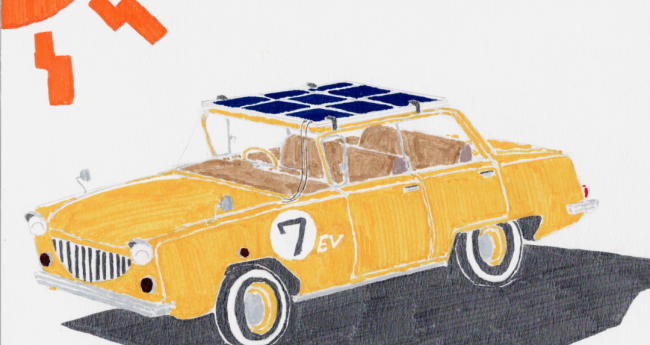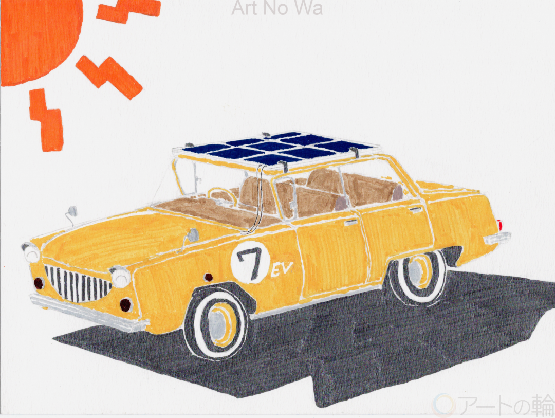 内燃機関をEVに、またソーラーパネルで電気を作ることによって、古い車でもクリーンかつ再生可能なエネルギーでこの先も愛されるように…そんな思いで描きました。