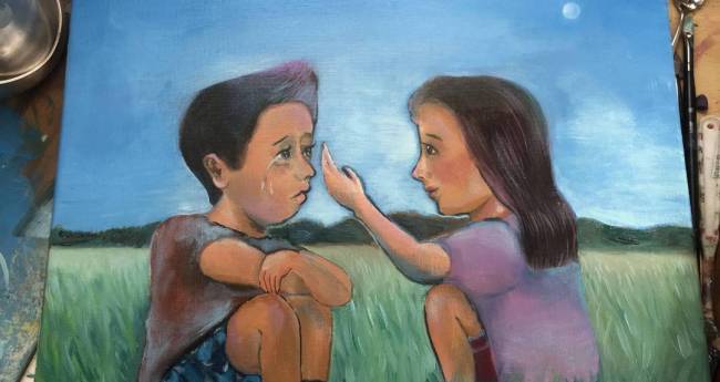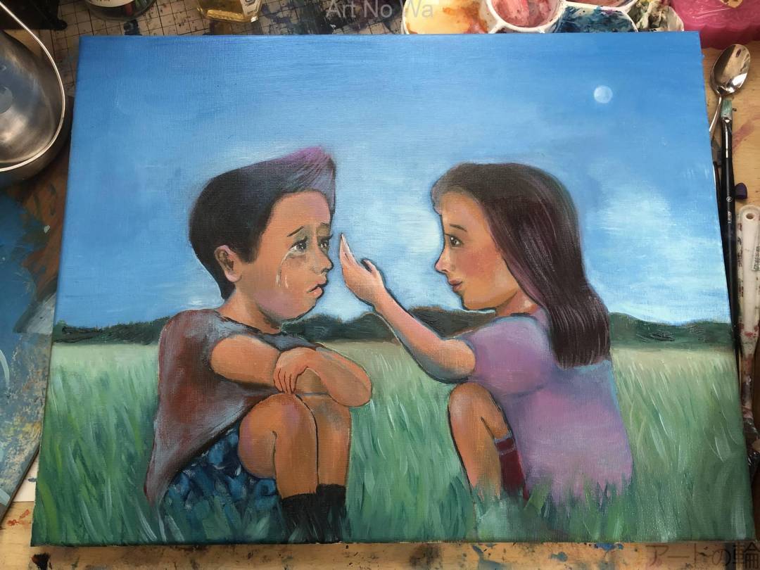 SDGsの目標5、ジェンダーの平等と女性や女児のエンパワーメントを図る、を自分なりの表現と解釈で描きました。「人と人と」というタイトルは、男性も女性も大人も子どもも、優しい心を持つとき示すとき、きっと同じ人同士なんだと思いました。人が人に愛を示すとき、きっと平等なのかなと思いました。