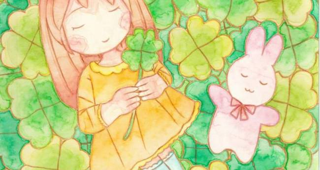 女の子と、うさぎさんが、四つ葉のクローバーが咲いた野原で、クローバーに願い事を想いながらお昼寝している所を描きました。A4サイズです。