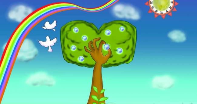 可能性とやる気の成長過程を樹で表現しました。毎日の積み重ねを太陽と月で表現しました。可能性をつかむ意味を込めて手の形の樹にしました。