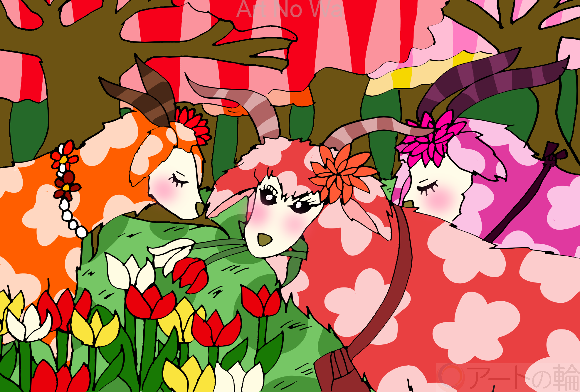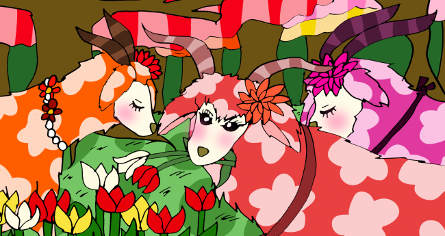 色とりどりの木や花が沢山ある森林の中で楽しそうに歩いているアンゴラの山羊を描いてみました。