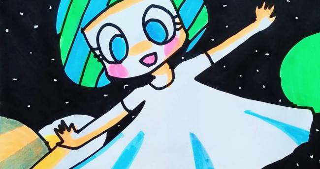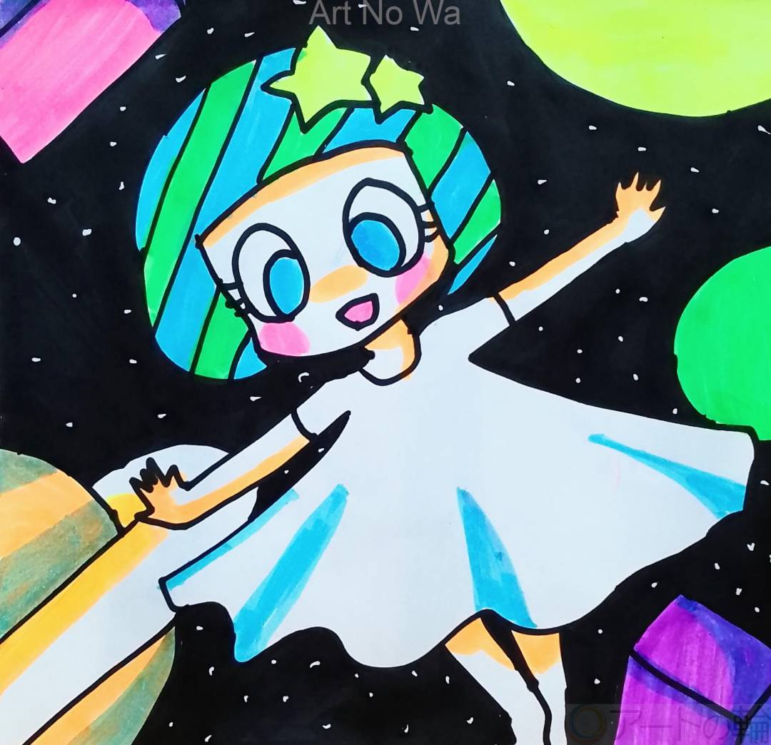 宇宙で無重力になって浮いている女の子を描いてみました。