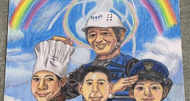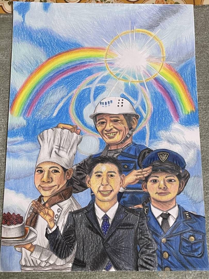 太陽に照らす虹を背景に仕事や現場で一生懸命働く人達を描きました。仕事で働く人達は将来警察官やパティシエ、人々の為に頑張りたいと夢を叶えた人達です。色鉛筆やクレヨンで光や影に沿って集中して描きました。服のしわも細かく綺麗に描きました。虹も光に沿って描きました。諦めずに夢を追って頑張ってほしい。自分の可能性や才能を信じて夢を叶ってほしい、そうすれば夢が現実になって叶える。自分達の幸せな未来が待っている、そう思って描きました。皆さんの夢や願いが叶いますように。