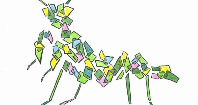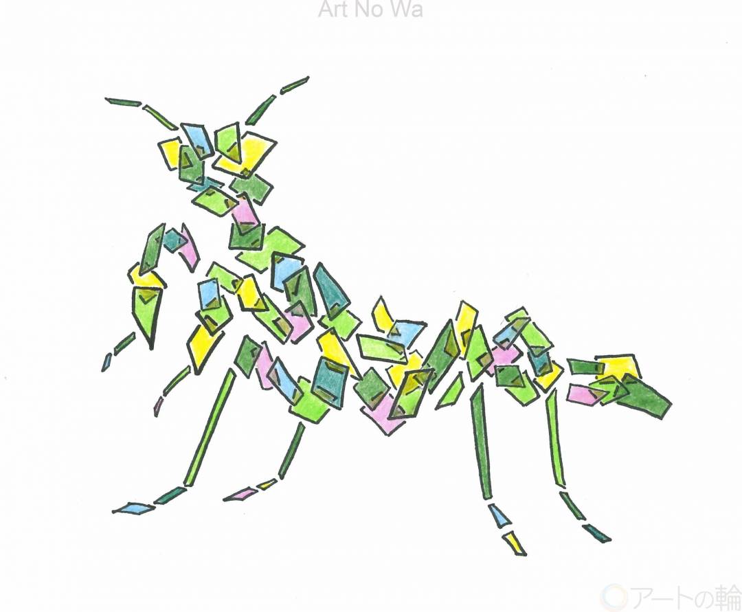 四角形を回したり動かしたりしていたら四角形で虫を構成できないかという考えが頭をよぎった。そこで強靭なカマを持つ絶対強者のカマキリを四角形を用いて描いてみることにした。