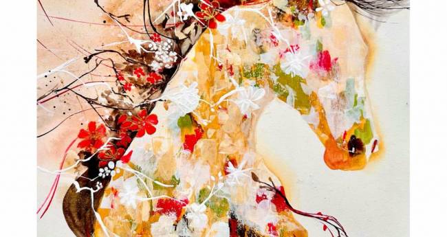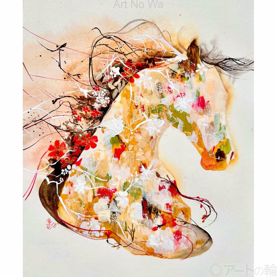 馬への親しみやすさ、想いや潜在的な感情を抽象的に表現した。 画材: 和紙、胡粉、水干、リキテックス、金泥