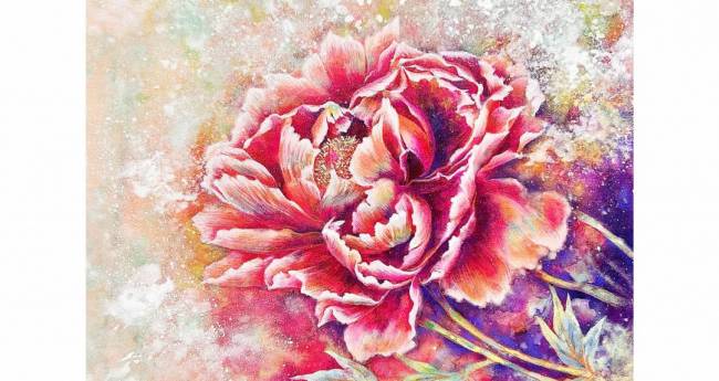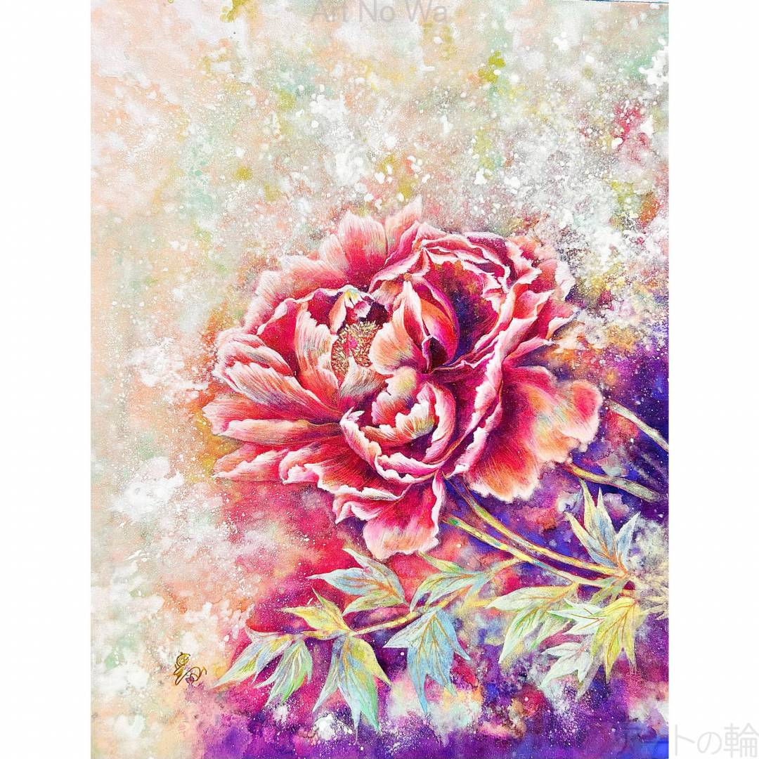 冨貴の香りと音を弾ませて咲く。庭に咲いた牡丹を見て、希望に胸を弾ませて命を謳歌する様子を表現した。 画材: 和紙、胡粉、水干、岩絵具、パール顔料、落松墨、金泥
