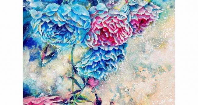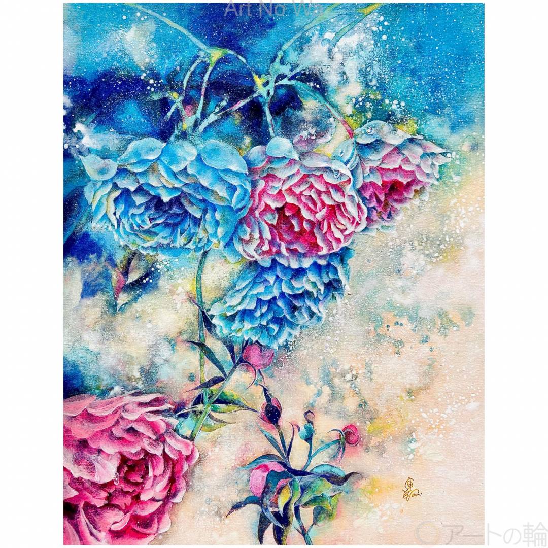 粛々と雨に項垂れながらも、纏った雨音は芳しい香りを放つ。友人の写真をイメージモデルとして、運命を受け入れ、選び取る生命力を再構築し表現した。画材: アクリルブロック紙、胡粉、水干、岩絵具、パール顔料、落松墨、リキテックス