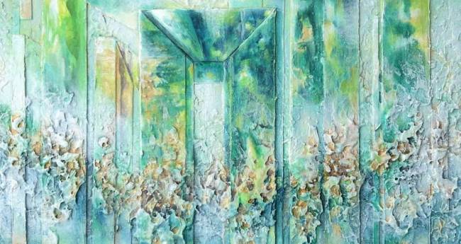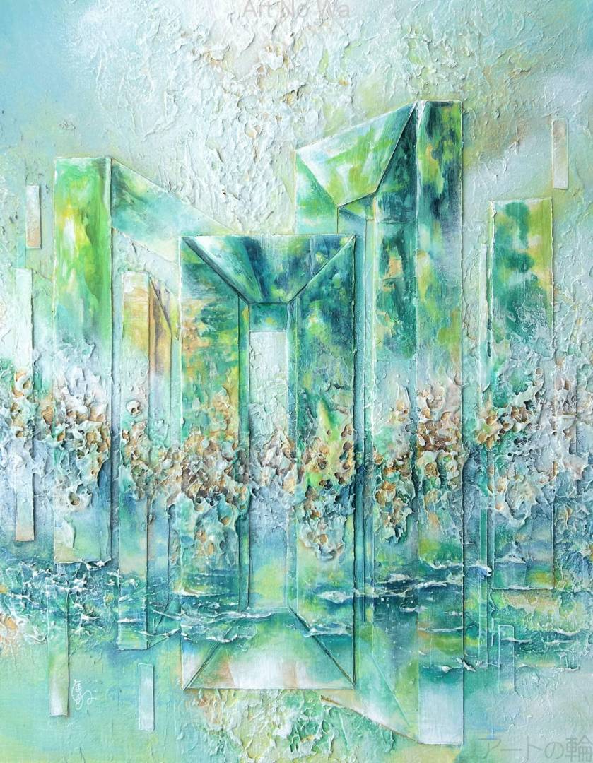 この端境の門を通る時、すべての事は赦される。友人の写真をイメージモデルとして、生命にまつわる悲しみや怒りを昇華する様子を表現した。画材:アクリルブロック紙、リキテックス、u-35、パール顔料、岩絵具