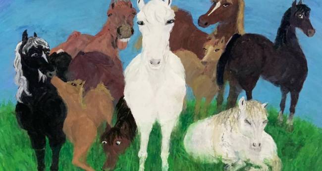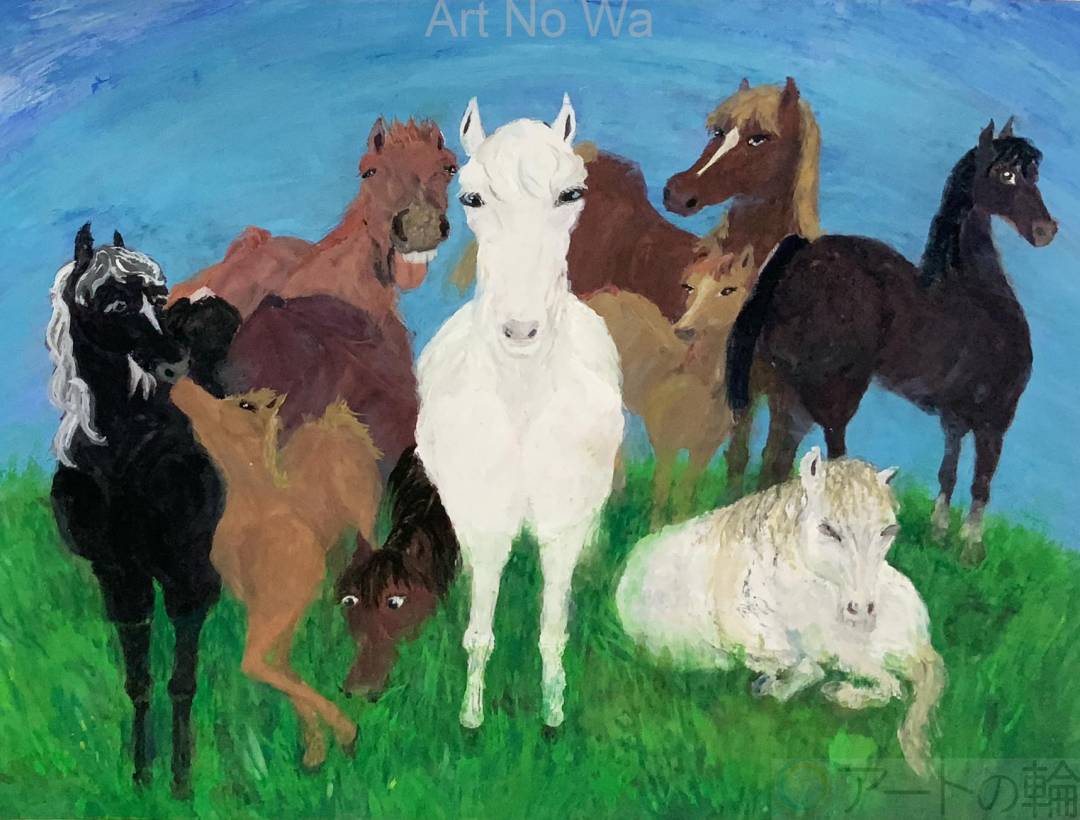 9頭の馬の家族を一つの画面に収めたいという思いから、今回の作品ができました。馬たちの表情は?年齢は?性格は?などと想像しながら、下描きを描き、画用紙に塗り始めるとそれぞれの馬の表情や雰囲気がくるくる変わり、何度も描いたり消したりを繰り返しているうちに、想像上の馬たちに個性が出てくることがわかりました。