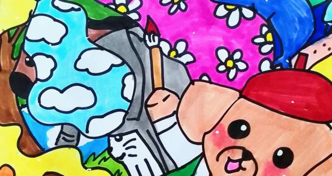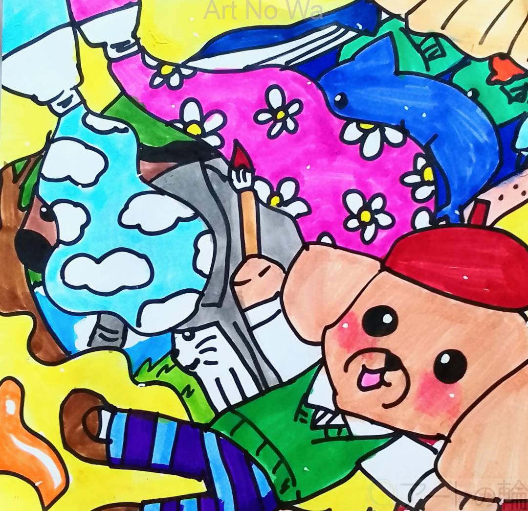 アートの楽しさを表現するために、絵の具の液体に模様をつけたりと楽しい雰囲気にしてみました。