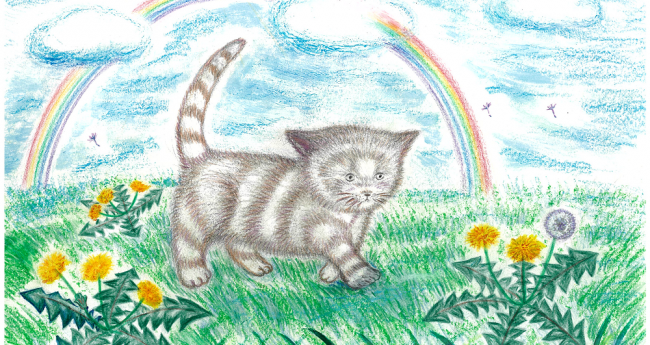 子猫が草原を横切って散歩する様子を描きました。