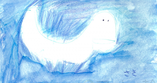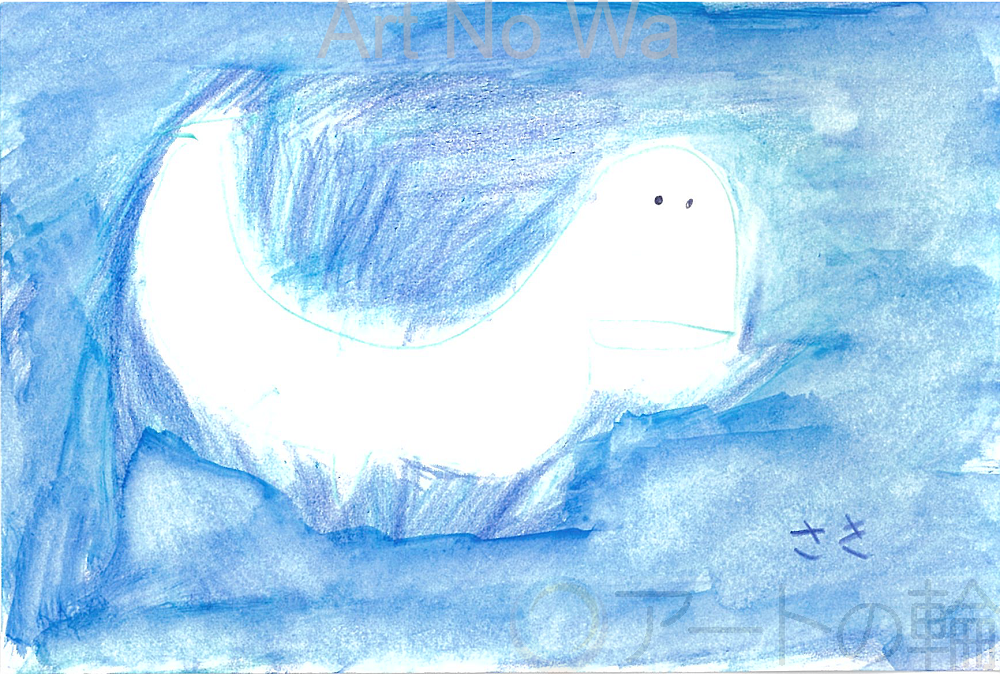 昨年度、水族館に行った時に見た白イルカの絵を描きました。水中の水の色を青系の色で重ね塗りをして最終的に水でぼかしました。