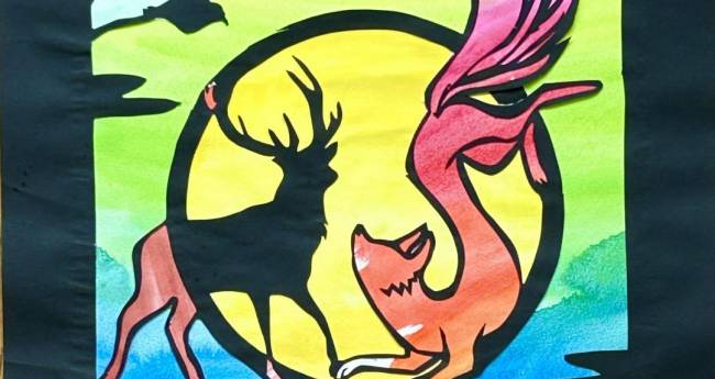 森には、四季折々の美しい花や鳥が舞い、月の光が優しく差し込む場所でした。 この森は、動物たちにとって特別な場所となっていました。 満月が空に輝いているある夜、赤い狐は、鹿と一緒に月明かりの下で遊び、お互いの友情の大切さを感じ、森を守ることを決意しました。 森を大切にし、共に過ごすことが何よりも幸せだと思いました という物語を思い浮かべながら切り絵で表現しました