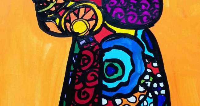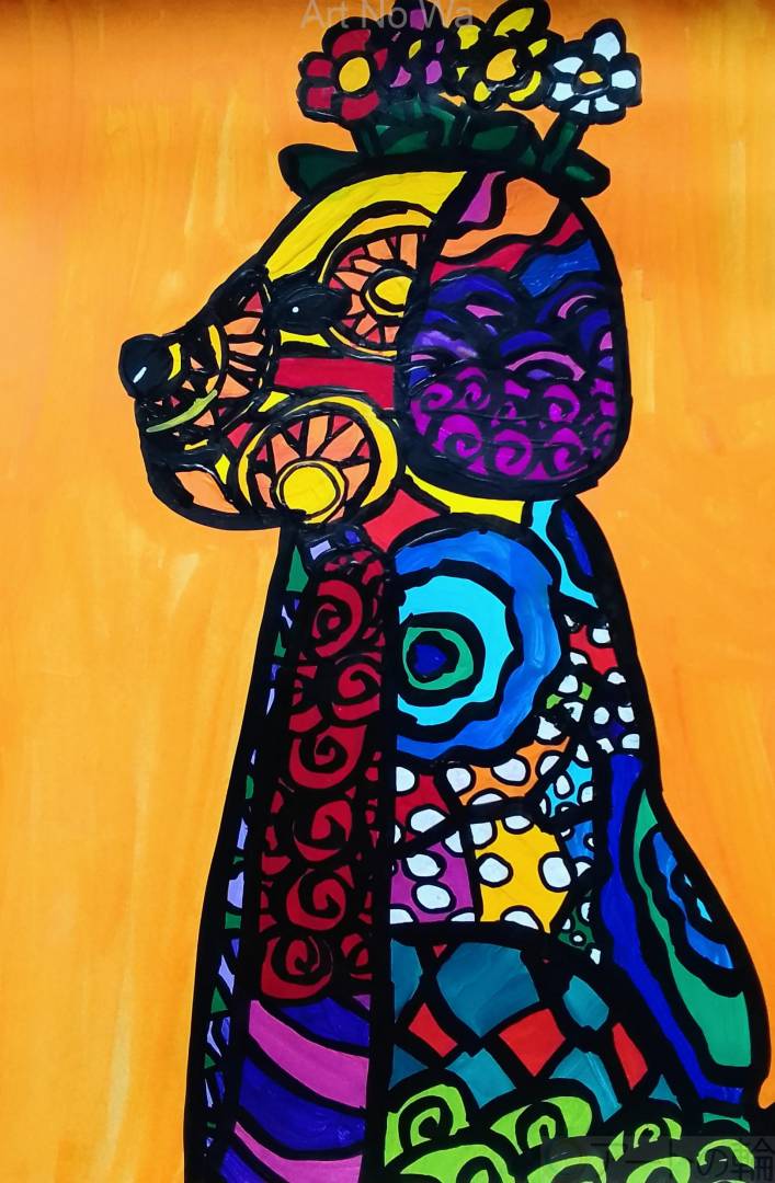 犬の色んな感情を沢山の模様で表現して描いてみました。頭の上の花は楽しい感情を表現しています。