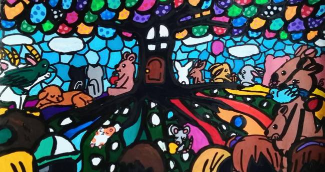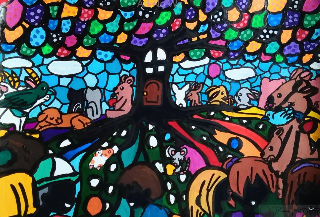大きな大樹の木の家の下で人間の子供や動物が楽しく過ごしている様子を描いてみました。