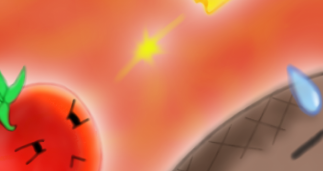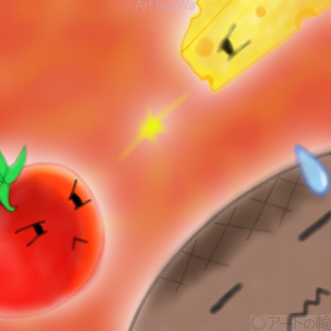 トマトチーズハンバーグを作るときに「トマトソースとチーズ、どっちを先にのせる?」という日常会話から生まれたイラストです。