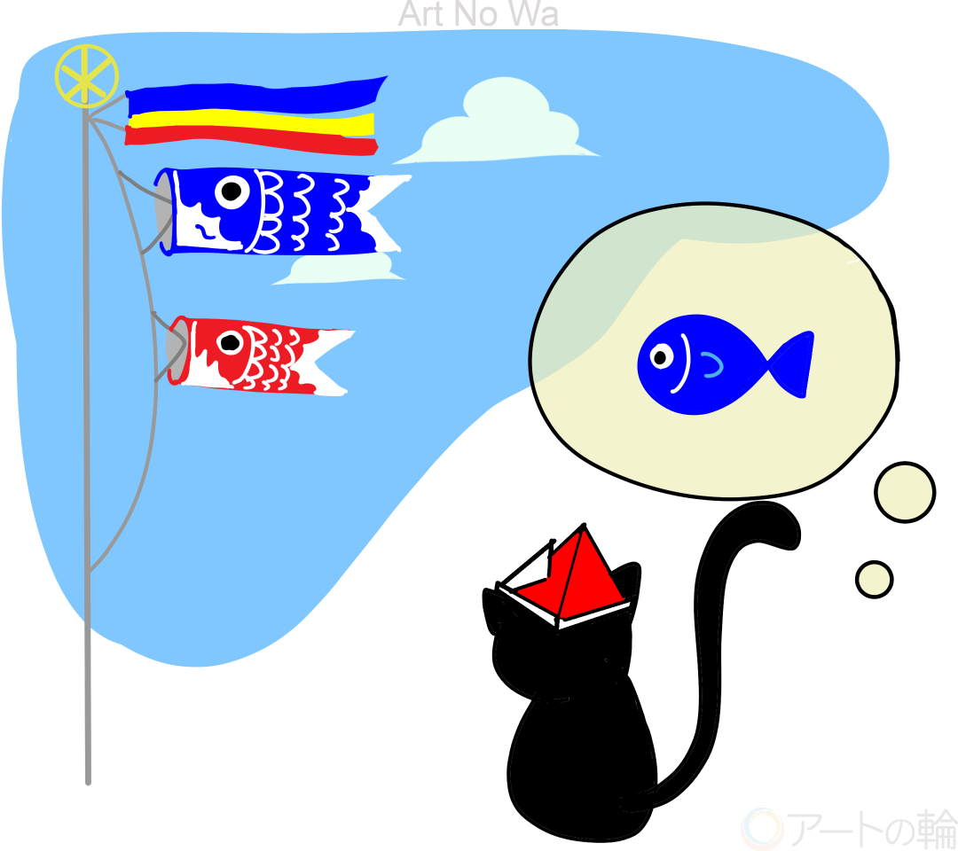クロネコが鯉のぼりを見て、好物の魚を思い出している様子を描きました。