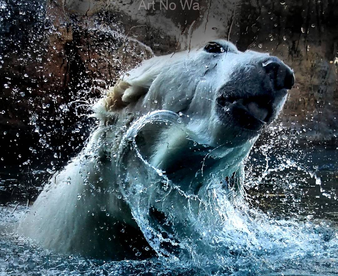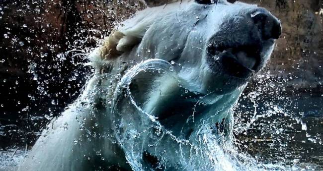 北極グマが水面に上がった瞬間、ブルブルと首を回して水を振り落としている姿は豪快さもあり可愛さもあります。