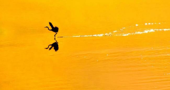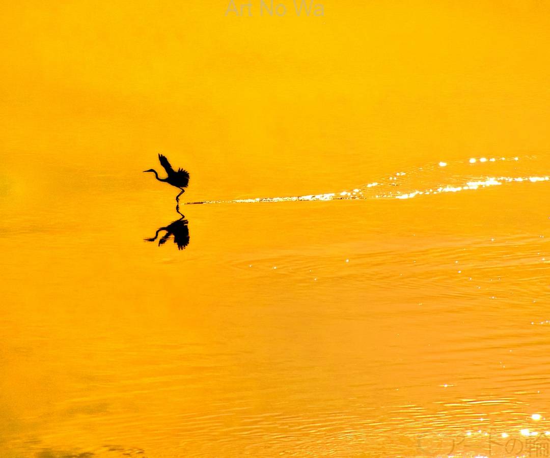 朝の川面に一羽の白鷺がエサを求めて移動している様を撮影したものです。