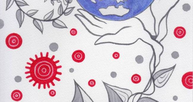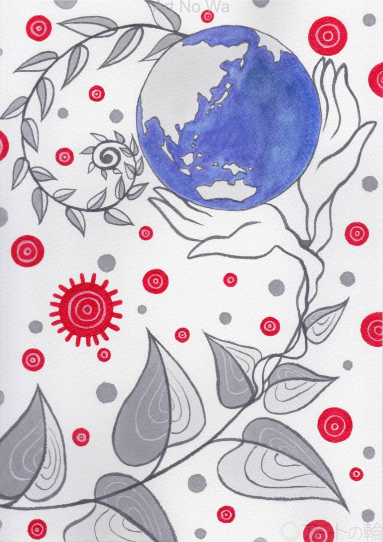 植物と調和した手のひらに守られたみんなの地球を太陽とモータをあらわした赤い光がやさしく照らしています。 水彩紙に墨液で描き、顔彩で色を塗りました。