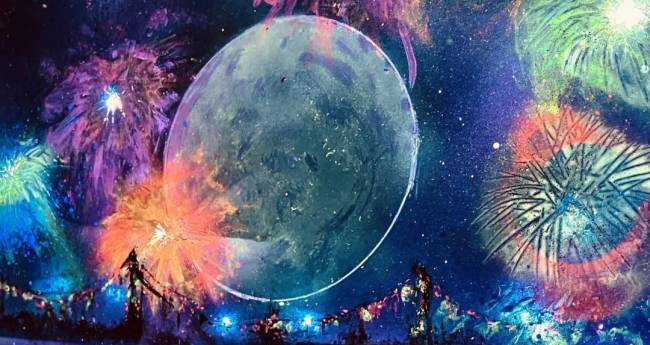 夏の夜空に、色とりどりの花火が咲く幻想的な一瞬を描きました。 大きな月と光のリズムが、見る人の心を照らすよう願いを込めています。 ブラックライトを当てると、花火や空が幻想的に輝く“光るアート”としても楽しめます。