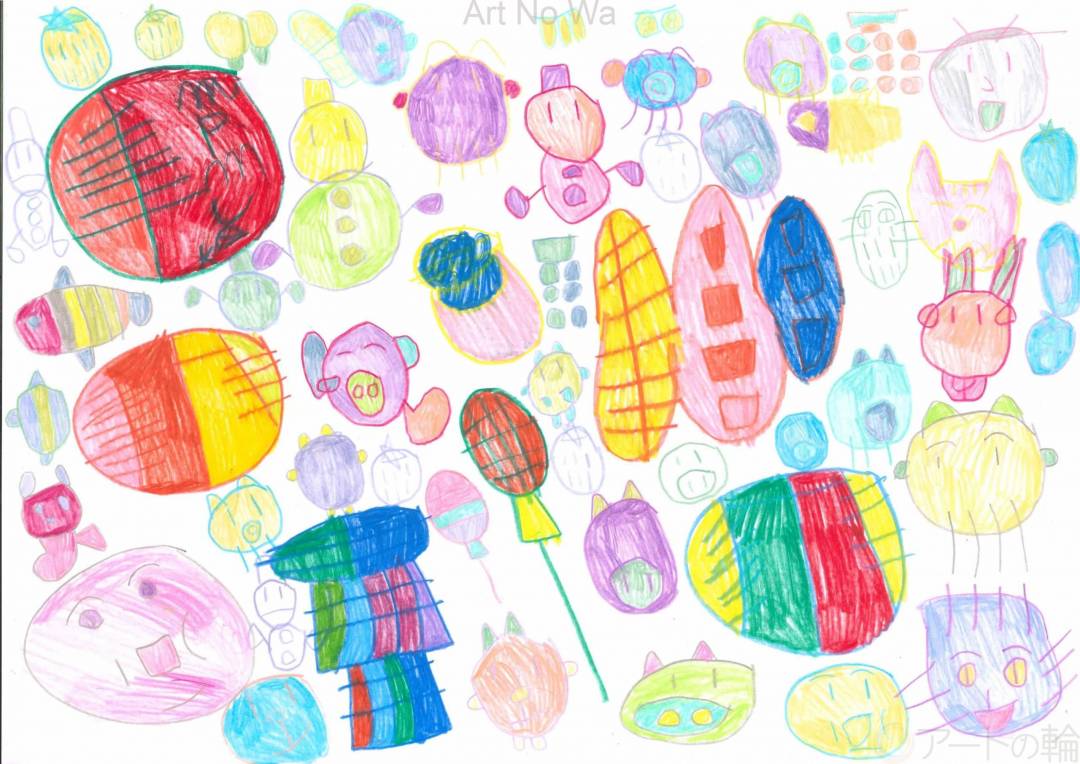この作品「ハッピー・パレード」は、色とりどりのキャラクターたちが画面いっぱいに広がり、まるで楽しげな行進をしているような印象を与えてくれます。 丸みを帯びたかたちや優しい色づかいは、見る人の心をやわらかく包み込み、それぞれのキャラクターが個性を持ちながらも、仲良く共存しているように感じられます。 一見すると自由に描かれているようでいて、色のバランスや配置に不思議な調和があり、リズムや物語性も感じさせます。 まるで、楽しい音楽に合わせてキャラクターたちがパレードしているようです。 この作品は、「ちがい」があるからこそ楽しい、「みんなちがって、みんないい」そんなメッセージが込められているようにも見えます。 誰もが笑顔になれる、希望あふれるパレードのような一枚です。