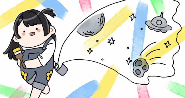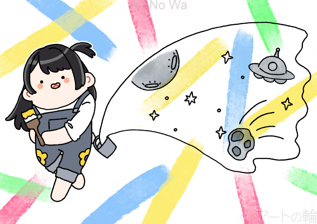この作品は宇宙の無限の可能性を描いているイラストです。小さい頃描いた宇宙の絵を参考にして描きました。