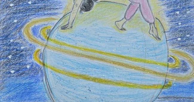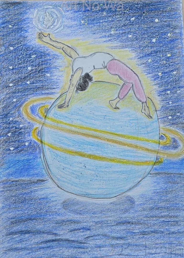 夜空と海のあいだに浮かぶ水星の上で、彼女はワイルドシングのポーズをとりながら、羽に向かって手を伸ばしています。足場は不安定でありながら羽に向かって手を伸ばしています。また、身体の軸はまっすぐに伸びていて、その姿からは「たとえ届かなくても、手を伸ばしたい」という強い想いが伝わってきます。 ワイルドシングは胸を大きく開いて心を解放するポーズです。その自由さとしなやかさが、宇宙の静けさと重なり、見る者の心に深く響きます。羽は夢や希望、あるいは過去の自分の一部かもしれません。 色鉛筆ならではの柔らかなタッチと深い青の世界が、空気や感情をやさしく包み込んでいます。幻想的でありながら、自分自身とも重ねたくなるような不思議な力を感じる作品です。