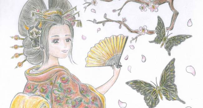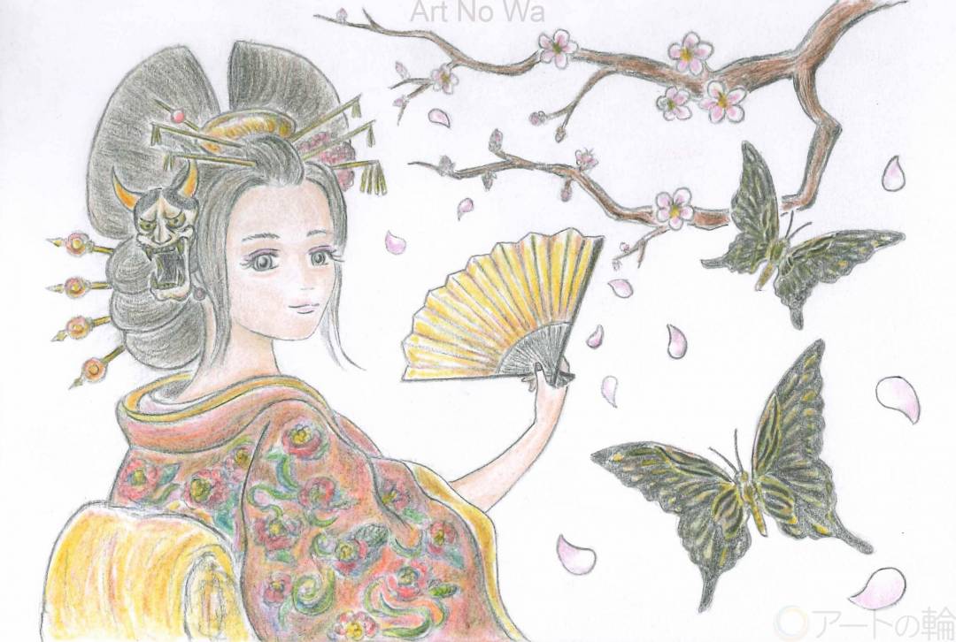 優雅に舞う花魁に魅了され、蝶が近づいてきた。散る梅の花びらを纏って共に舞い踊れ。