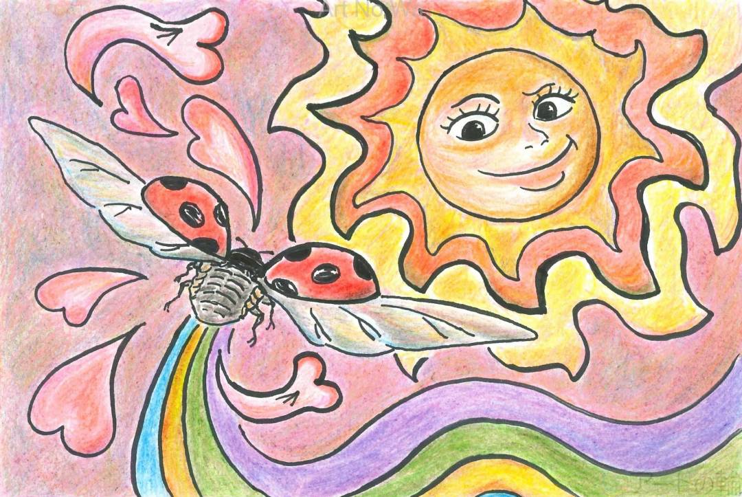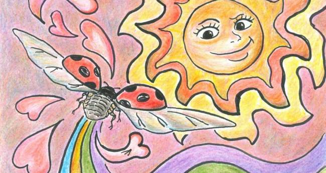 太陽に向かって飛ぶテントウムシ。まるで太陽に恋してるみたい。太陽に夢中なんだね。