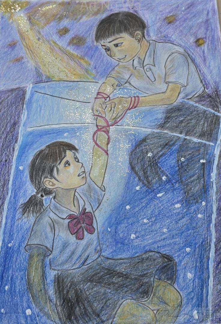 この作品には「限界を超えているのに、自分では気づけない心の状態」をテーマとしました。 魔法瓶のコップの中にいる少女は、無理をしている自覚もなく、静かに沈んでいく存在です。彼女は助けを求めているわけではなく「まだ大丈夫」と思い込んでいる。 だからこそ、この絵を描いていてその沈黙に気づいてくれた「大切な誰か」の存在が何よりも救いなのだと感じました。 二人を結ぶ赤い糸は、恋の象徴ではなく、痛みを知る者同士だからこそ生まれた共鳴と優しさの繋がりです。 制作を通して、私自身がかつて感じた孤独や苦しさとも向き合うことになりましたが、描き終えたときには不思議と温かさや希望が残りました。 この作品が、誰かの沈黙や限界にそっと目を向けるきっかけになれたら嬉しいです。
