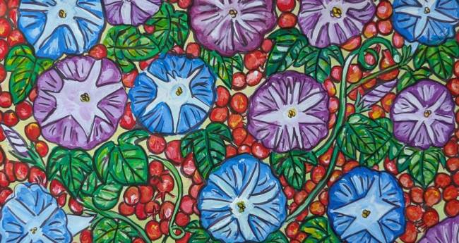 小学生の頃朝顔を育てた。懐かしい。バックが淋しいのでジューンベリーを描いてみた。