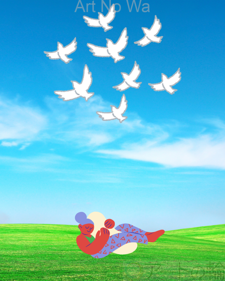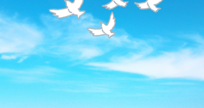 青空をどこまでも続いており、鳩もまた仲間とともに自由に飛んでいきます。今回の作品は「自由」と「どこまでも広がっている」をテーマにしました。