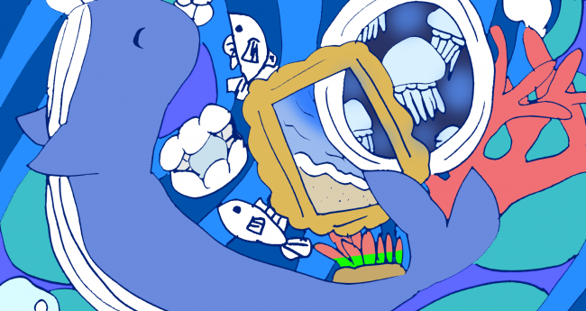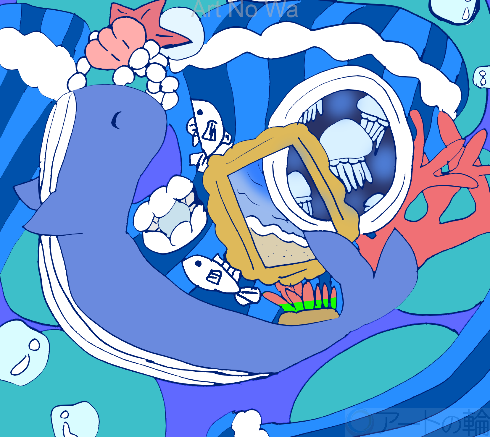 額縁に入った海や生き物をクジラや波で包むように描いてみました。