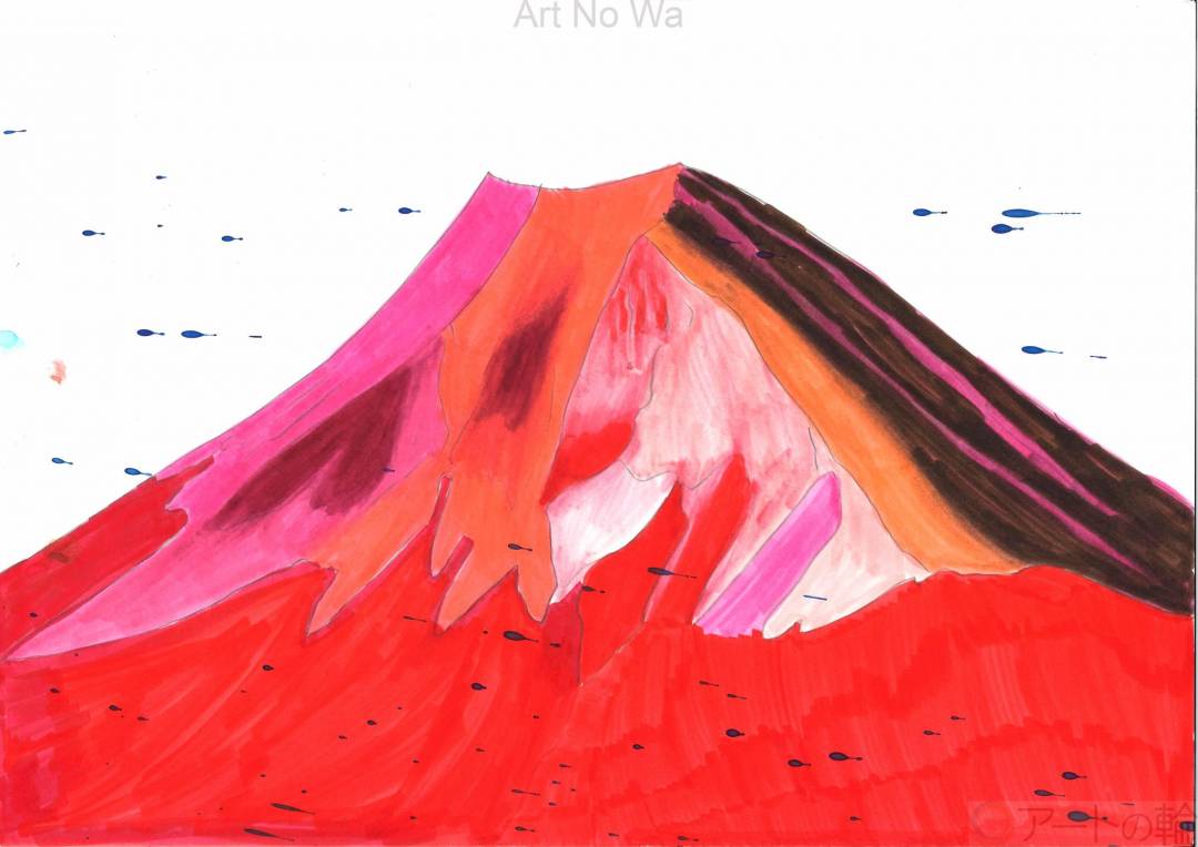 朝焼けの富士が大好き。なぜ白い雪が赤く見えるのかが不思議。大らかにフェルトペンを動かしていきます。A3サイズに大きく描き、次に別にうちわ用に小さく描き上げ、これまたご自慢です。