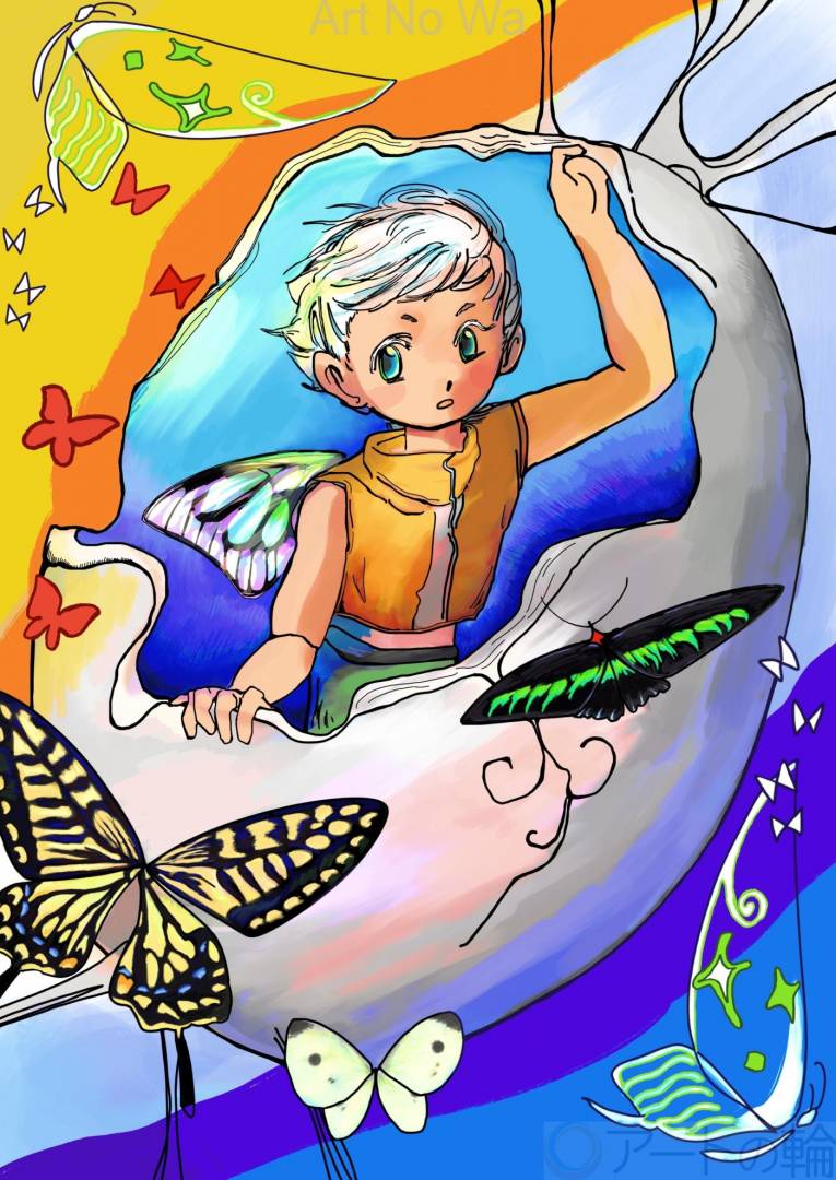 無限の可能性に向かって進みたいという思いを、繭から出て羽ばたこうとする子供の姿で表現しました。