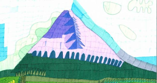 お母さんの故郷は富士吉田。ママの車で帰省すると、富士山に挑戦。いつも晴天に恵まれ、山頂のあたりに小さな赤い丸を一つ。太陽のつもり。