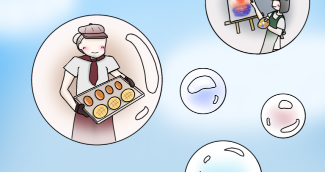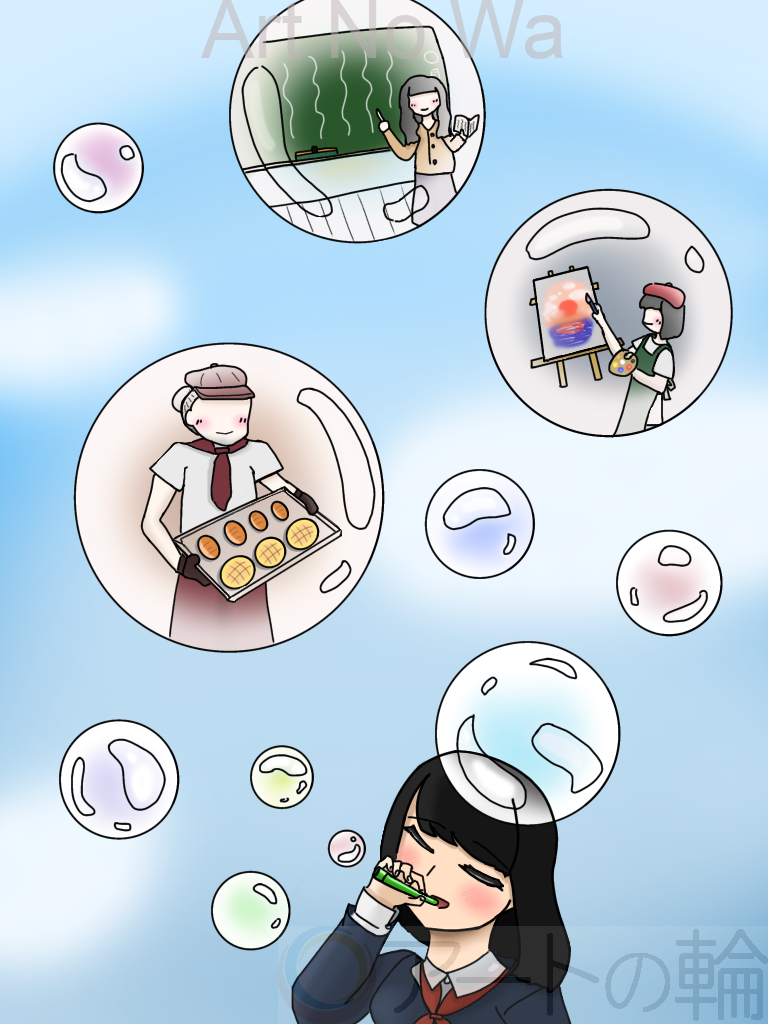 このイラストにおいて、シャボン玉を用いている理由としては、自分で作り出したシャボン玉の中にあらゆる未来の自分の姿を描くことで、自分の未来(可能性)を自分で生み出しているというふうに表現しました。