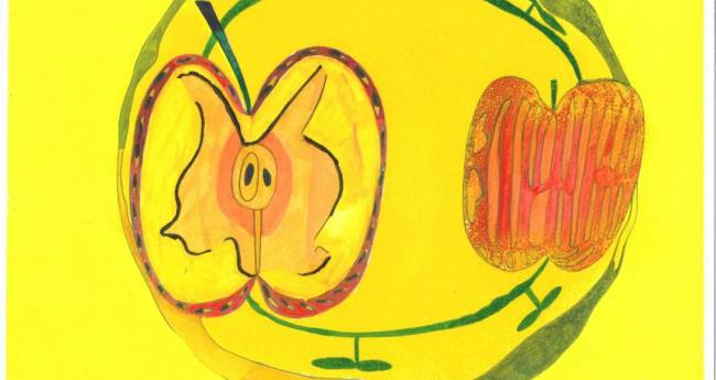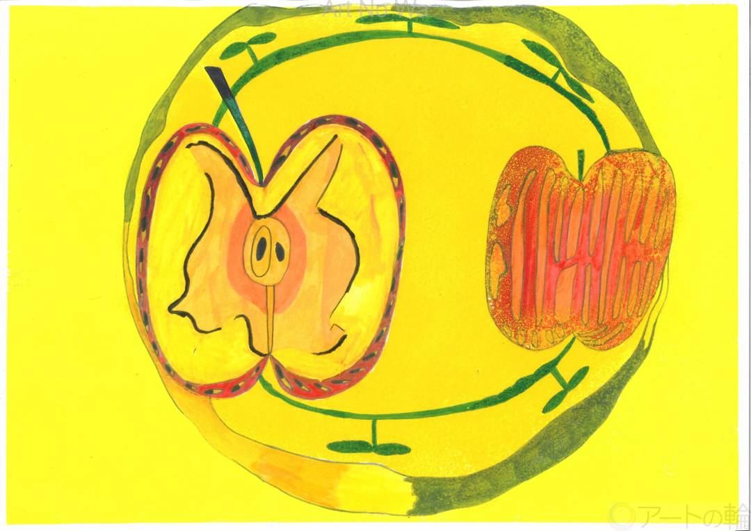 外側は、赤い。中はどうなっているんだろう?不思議?桃太郎のおばあさんになった気分で「エイヤー。」半分に切った。茶色い種やら、蜜がトロトロ。「なめなめしないで!!」絵を描き終るまでおあずけです。スイカは緑色の中が赤いし、たくあんは黄から黄色です。