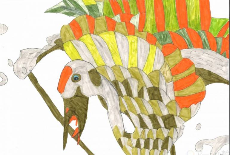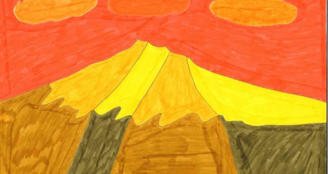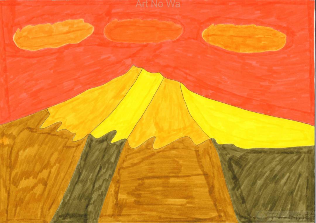 A3の画用紙に、富士山を元気いっぱいに描きます。色は大好きカラー赤朱黄。最後に、富士山を眺めて見て、やっと茶色。続いて、空に雲一つ出てきたので、もう一枚の画用紙にもう一点富士山を続けて描き、雲一つを加筆。後日、自分の絵を見ながら富士山を描いて、富士山シリーズは終わりました。