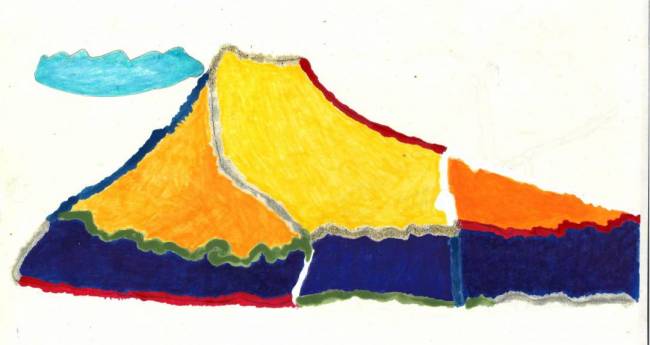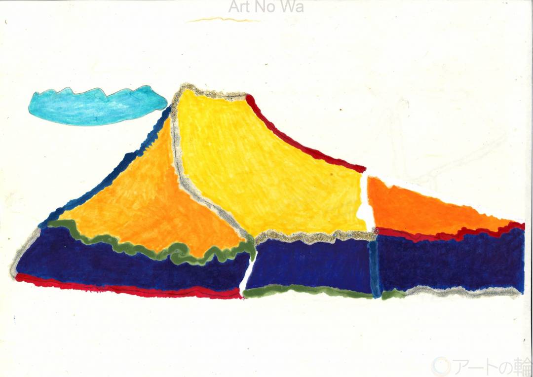 A3の画用紙に、富士山を元気いっぱいに描きます。色は大好きカラー赤朱黄。最後に、富士山を眺めて見て、やっと茶色。続いて、空に雲一つ出てきたので、もう一枚の画用紙にもう一点富士山を続けて描き、雲一つを加筆。後日、自分の絵を見ながら富士山を描いて、富士山シリーズは終わりました。