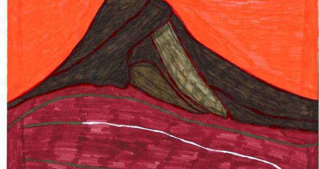 A3の画用紙に、富士山を元気いっぱいに描きます。色は大好きカラー赤朱黄。最後に、富士山を眺めて見て、やっと茶色。続いて、空に雲一つ出てきたので、もう一枚の画用紙にもう一点富士山を続けて描き、雲一つを加筆。後日、自分の絵を見ながら富士山を描いて、富士山シリーズは終わりました。