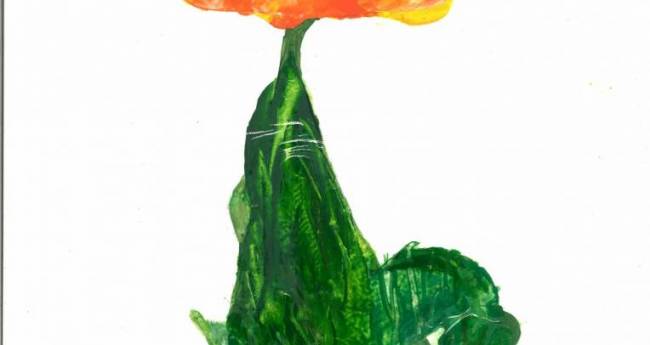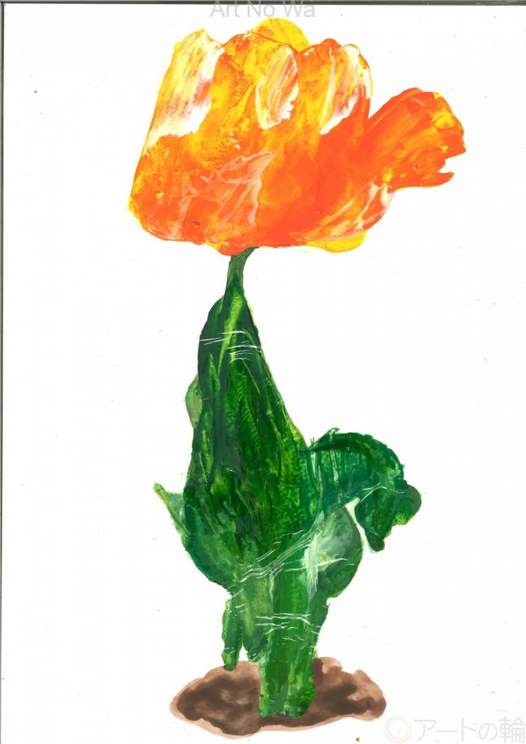 ペインティングナイフに赤と黄の絵具をのせて、「チューリップの花です」と小声でささやきながら、ペタペタ。「1、2、3」ヨコ、ヨコ、ヨコです。次は、「葉です」と、タテ、タテ、タテと緑色をつづけます。