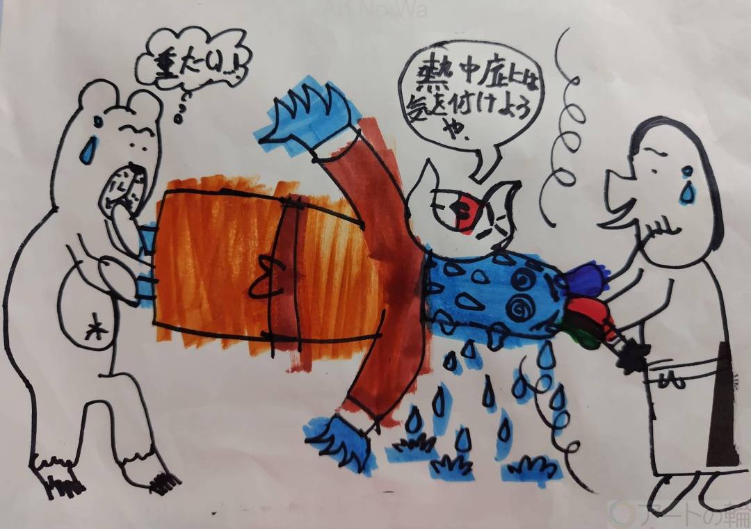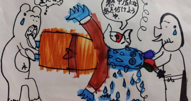 現実,非現実,屋内,屋外,自然,過去,現在,未来,夏,6月,7月,8月,9月,水色,黒,人物,動物,想像上の生き物,大人,おじいさん,明るい,たのしい,かわいい,わくわく,どきどき,びっくり,2D