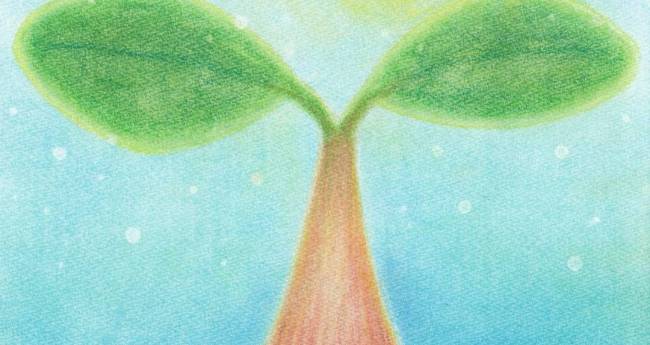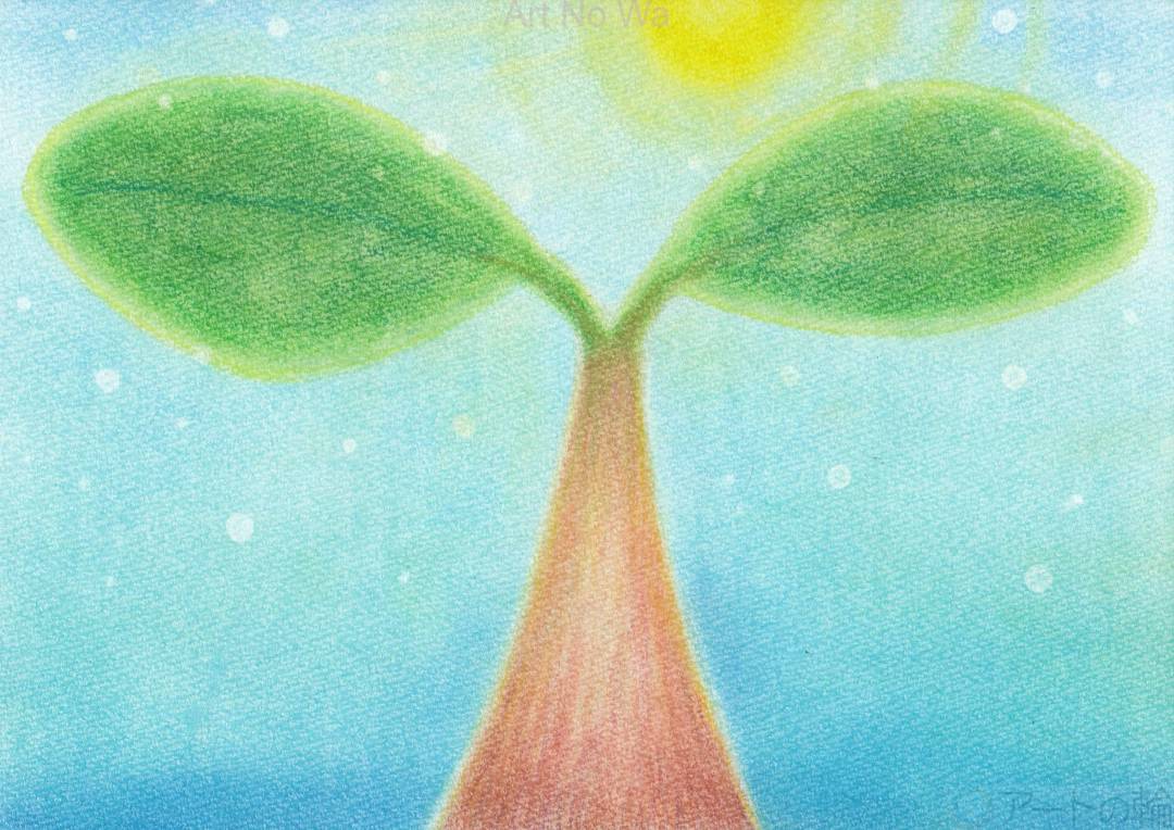 地面から芽吹いた双葉が太陽に向かってぐんぐん伸びていくところを描きました。太陽は未来です。可能性を秘めた双葉がどんな風に育つのか、どんな花を咲かせるのか、楽しみですね。