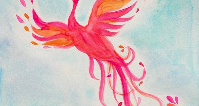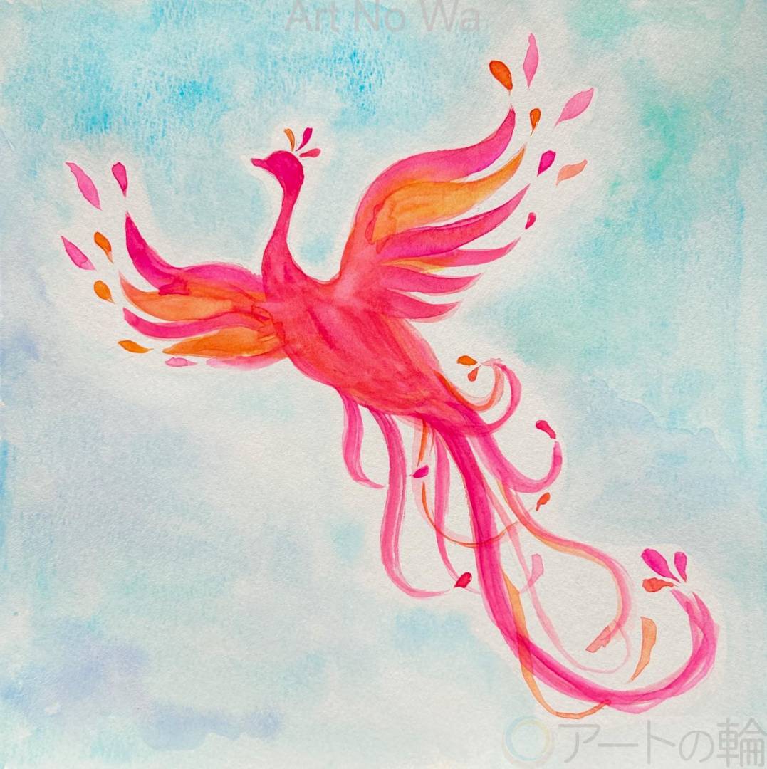 鳳凰は、雄を鳳、雌を凰と呼ぱれています。平和な世に現れるとされている聖天子の出現を知らせる瑞兆とされているそうです。平和な世界を願って描きました
