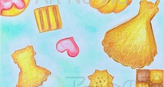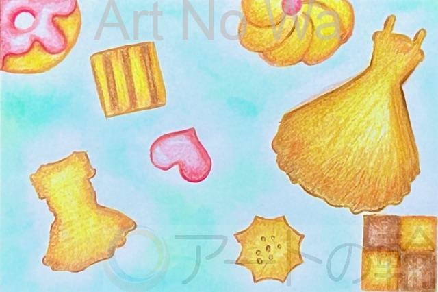 とっても美味しそうで可愛らしいドレスクッキーとクッキーたちを色鉛筆で丁寧に描きました