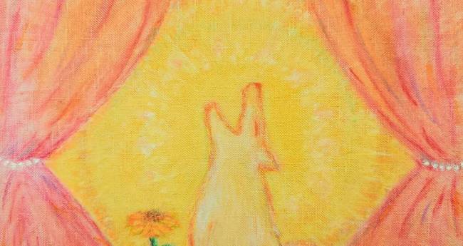 『重たいカーテンを開けたなら、待っていたのは燦々ときらめく黄金の朝日。外はきっと素敵な可能性に満ちあふれてる。さあ、一緒に行こう。最初の一歩を踏み出そう!』そんな気持ちを、愛犬をモデルに描きました。
